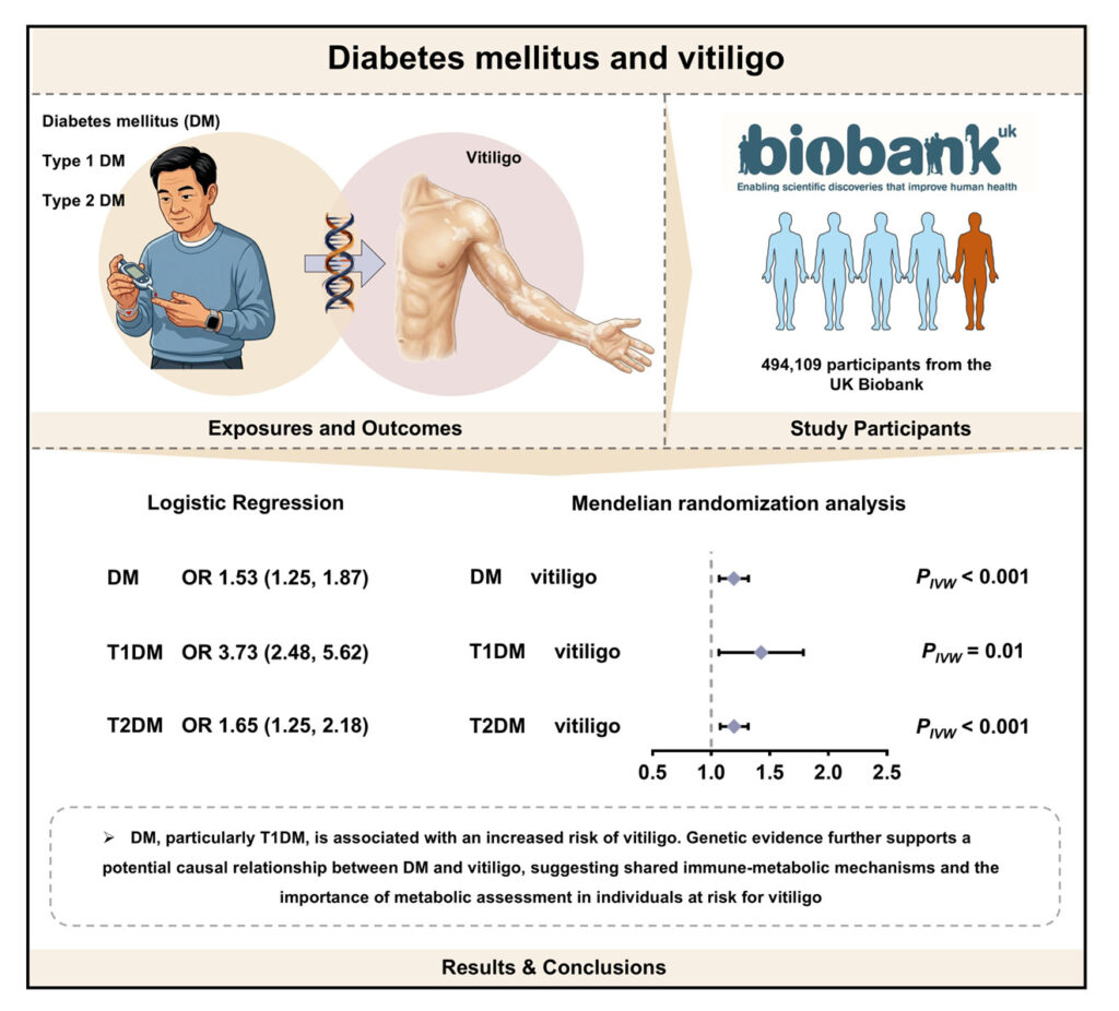 大規模医療ビッグデータ解析とMendelian randomization(MR)を併用し、糖尿病と白斑の関連を網羅的に解析するとともに因果関係の可能性も検証した、大規模データベースと遺伝疫学を統合した研究です。